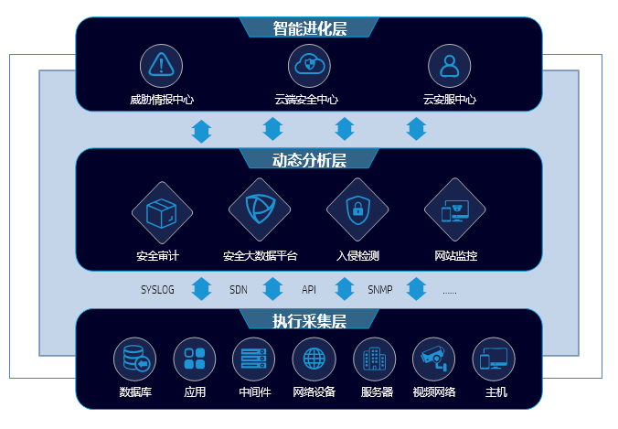 智能进化层:为“执行采集层”和“动态分析层”提供安全能力的持续增强,达成整网安全能力的可持续演进。