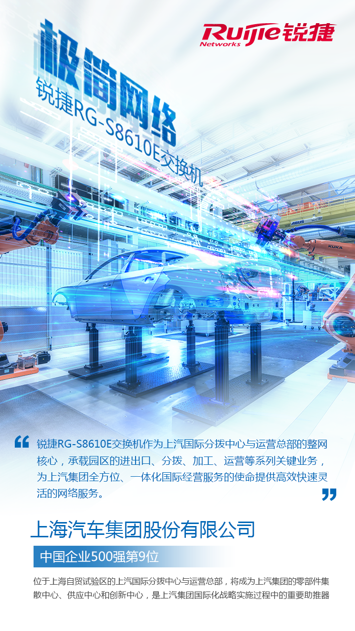 尊龙时凯RG-S8610E交换机作为上汽国际整网核心,承载园区的进出口、分拨、加工、运营等系列关键业务,为上汽集团全方位、一体化国际经营服务的使命提供高效快速灵活的网络服务。