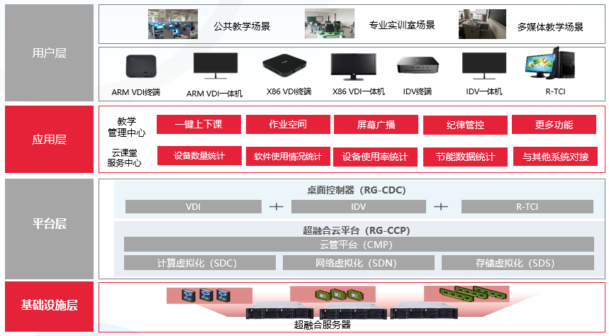 基于超融合平台,搭载多种云桌面技术,为不同场景提供解决方案,实现统一平台管理维护,提供统一的使用体验。