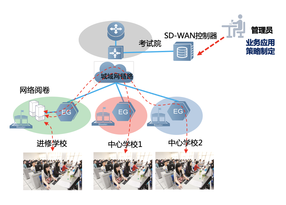 针对考试业务相关数据和业务,比如视频上传、阅卷等,SD-WAN技术可快速制定基于业务应用的调度策略,实现可视化业务策略制定