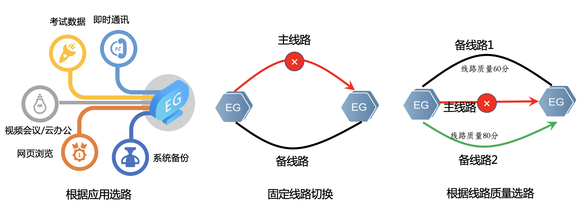 SD-WAN支持多种链路模式,如专线、Internet、5G、VPN等,也可混合组网。在多WAN出口线路的情况下,SD-WAN技术可灵活规划最适合的选路,确保体验最佳。例如,考试业务可选择线路质量最好的线路,一旦当前选中的链路出现故障或者质量不佳的情况,可快速实现链路自动切换,确保体验最佳