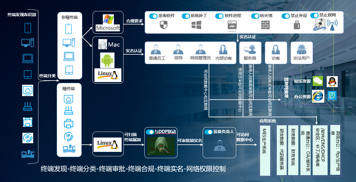 SMP+能够自动发现全网终端,并且智能根据终端的类型(自动却分普通终端与哑终端),决定是否需要实名认证,或是需要通过“中通宝盒”扫描二维码入网和自动审批入网。例如:对哑终端进行合规放行,直接进行审批准入,快速而便利,可以无须实名,避免了用户名密码输入;对Windows终端进行病毒防御策略检测,包括杀毒软件安装检测与推送、不合规软件安装检测、系统补丁检测与推送,防火墙开启检测、外设管控等策略。