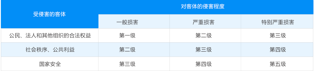 将网络系统按照重要性和遭受损坏后的危害性分成五个安全保护等级。信息系统定级原则:"自主定级、专家评审、主管部门审批、公安机关审核"。