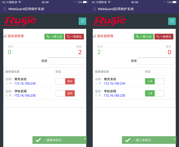 采用移动端(例如手机等)浏览器访问WG,可显示所有服务器列表,具备一键上线离线的应急响应按钮,可在安全事件爆发时进行快速处置。
