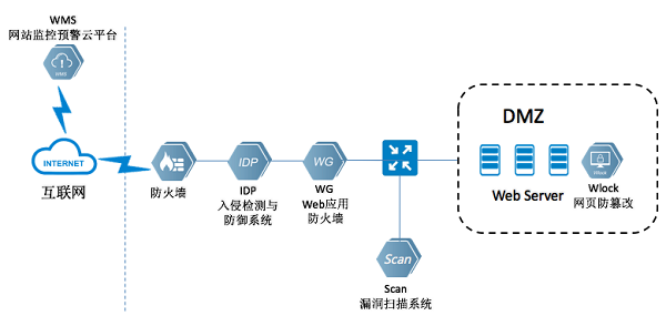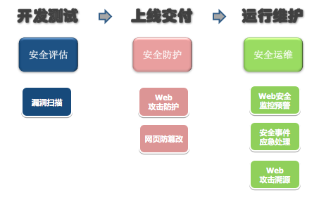 方案从安全评估、安全防护和安全运维三个层面,完整涵盖Web应用系统生命周期中从开发测试到上线交付,再到运行维护的各个环节,实现系统发布前的漏洞扫描、上线后的攻击防护、日常运维的安全监控与审计管理。