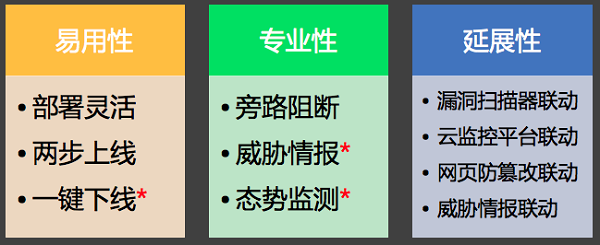 Web应用防火墙(WAF)是针对Web应用的特点发展而来的专业安全产品,能够有效地防护SQL注入、XSS跨站脚本等Web攻击。企业组织应在传统防火墙、IPS边界防护的基础上,增配WAF设备保护Web应用。