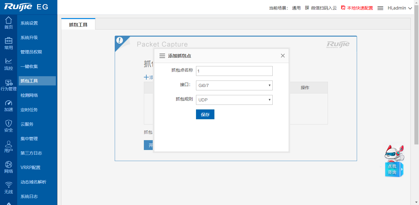 (1)在EG的WEB页面点击“高级-抓包工具”打开“抓包诊断工具”(老版本EG点击“高级-一键收集-抓包诊断工具”)
