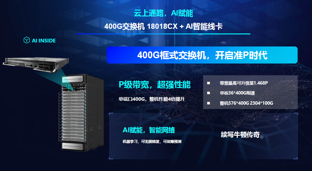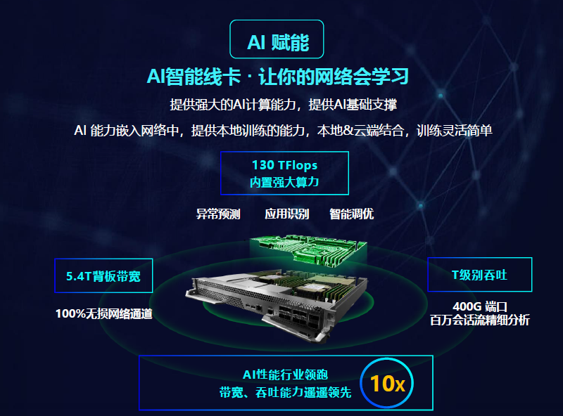 极简XS智能网络利用AI智能线卡将AI能力嵌入网络之中,提供了本地训练与云端结合的融合计算,为机器学习提供了更加灵活多用的训练模式。它同时更是一台“超级AI发动机”,不仅提供了5.4T背板带宽、单端口400G、带宽1.468P的接入能力,其浮点运算能力更达到了130TFlops,AI性能超越行业平均水平的10倍以上,足以应对复杂的网络业务需求。
