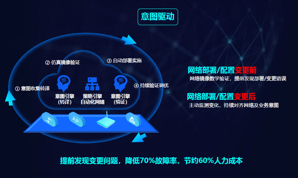 除了强大的算力, 极简XS还通过意图收集转译、仿真镜像验证、自动部署实施、持续优化调优,为帮助企业实现意图识别提供了变更前后自动化配置与智能运维,提升业务敏捷性,提高运营模式前瞻性,构建以用户体验为中心的智能生态系统。