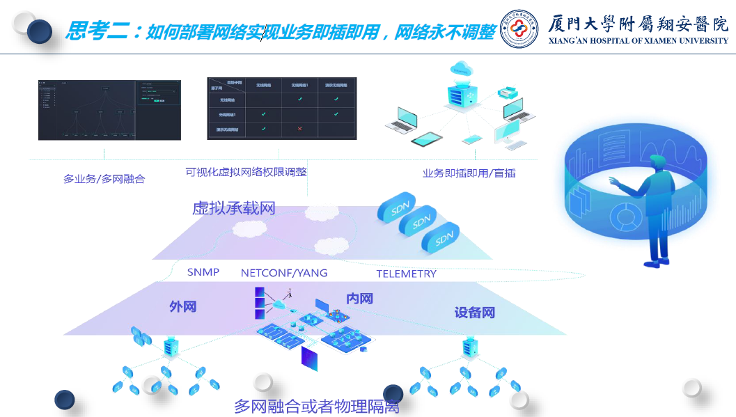 在经验分享环节,厦门大学附属翔安医院信息中心李振叶主任带来了《后疫情时代下的医院信息化建设与思考》精彩演讲,结合教育行业、医疗行业的数据中心安全、物联网在医疗一线的具体应用,以及疫情期间“火神山”医院信息系统建设的具体情况进行了介绍。她提出的“部署智能网络,实现业务即插即用,网络永不调整”的思路,在数千名线上参会嘉宾中引起了广泛共鸣。