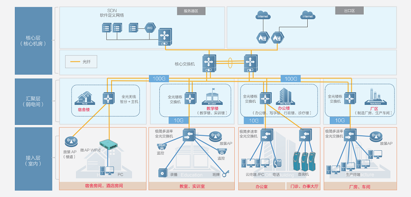 在此背景下,尊龙时凯推出极简以太全光解决方案,面向教育、商旅、办公等园区应用场景,通过全新光纤入室的部署方式,结合以太网,通过架构简单的组网和SDN技术,在万物互联的数字时代为园区业务提供面向高带宽、低延时、高度灵活、极简运维的网络承载,支撑未来十年业务演进,保障应用体验和投资价值。