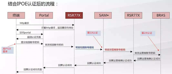 注意,上面BRAC方案的1次认证,是WEB认证。只要将NAS设备更换为RG-RSR77-X路由器即可完成。这里的RG-RSR77-X路由器 是作为1次认证的NAS设备,原BRAC方案中的出口路由器不做变化。这样改造后,BRAC方案的组网设备就是2台RG-RSR77-X路由器,一台做内网IPoE认证,另一台是连接外网做PPPoE代拨。这样变化后,校园网就能使用IPoE认证了。