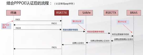 与结合IPoE认证类似,还是要把原方案中的NAS设备换成RG-RSR77-X路由器,此时网络中就有2台RG-RSR77-X。一台原出口充当PPPoE代拨。另一台是NAS,同时充当PPPoE Server 角色,直接为学生服务,学生使用普通电脑或小路由器做PPPoE Client,在电脑上创建拨号连接,校园网账号密码以PPPoE报文的形式,发送给RG-RSR77-X路由器,然后转发给RG-SAM+,做第一次认证;然后将该学生对应的运营商账号密码发送给出口的RG-RSR77-X路由器,再转发给运营商的BRAS设备,由BRAS设备做第二次认证。认证成功后,将消息回复经由出口处的RG-RSR77-X路由器->RG-SAM+->NAS角色的RG-RSR77-X路由器-> 终端,于是学生就可以上网聊天打游戏了。