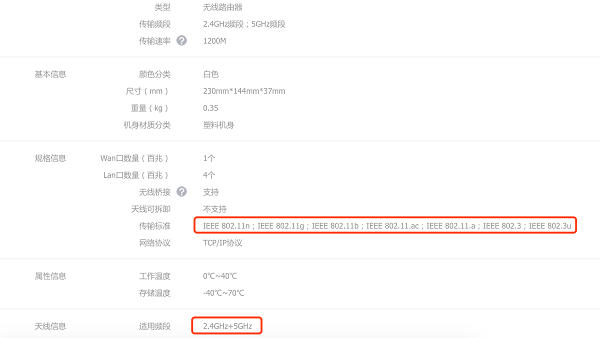 不过,当你想为自己的小家买个无线路由器时,一定会看到各种让人眼花缭乱的规格参数,比如下面这个设备就支持不同的IEEE 802.11协议标准,你知道这些标准是什么意思吗?它们的区别是什么?该如何选择路由器?