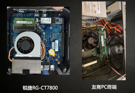 最终,采用一体化集成设计RG-CT7800正式问世,在性能指标大幅提升的基础上,实现了操作系统、办公应用及外设的兼容,并且实现了本地部署与虚拟化云桌面的多场景应用。
