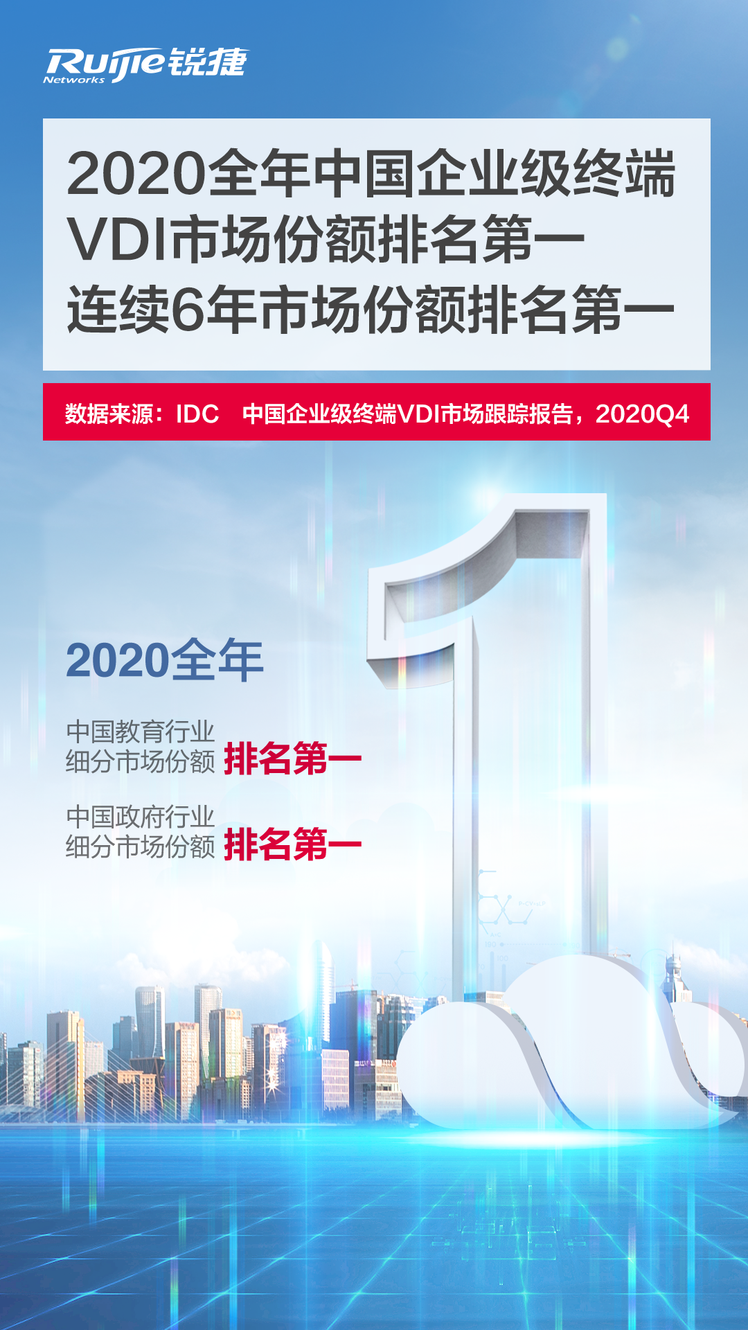 根据权威咨询机构IDC最新发布的2020年中国企业级终端VDI市场报告显示,尊龙时凯网络VDI以34.7%的市场份额,再次位居市场排名第一,连续六年实力领跑云桌面市场。