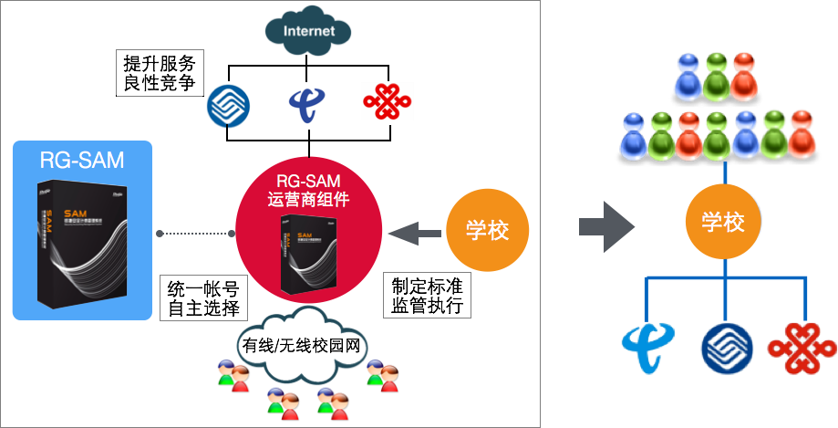 通过RG-SAM运营商组件搭建运营商和校园网用户之间的准入平台,运营商不直接面对用户提供服务;高校通过对RG-SAM的控制来评估运营商的服务质量和运营情况。就好像高校校园网中只有一条信息高速公路,所有的关卡设置、资费标准、限速规则都统一由学校设定,运营商只在这条公路上提供个性化的服务就可以了。