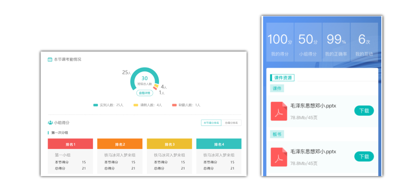 师生课堂效果如何,在课后,平台还可以自动推送课堂报告给师生,生成考勤记录和互动记录,留存讨论、板书成果,便于老师改进教学,学生回顾知识。