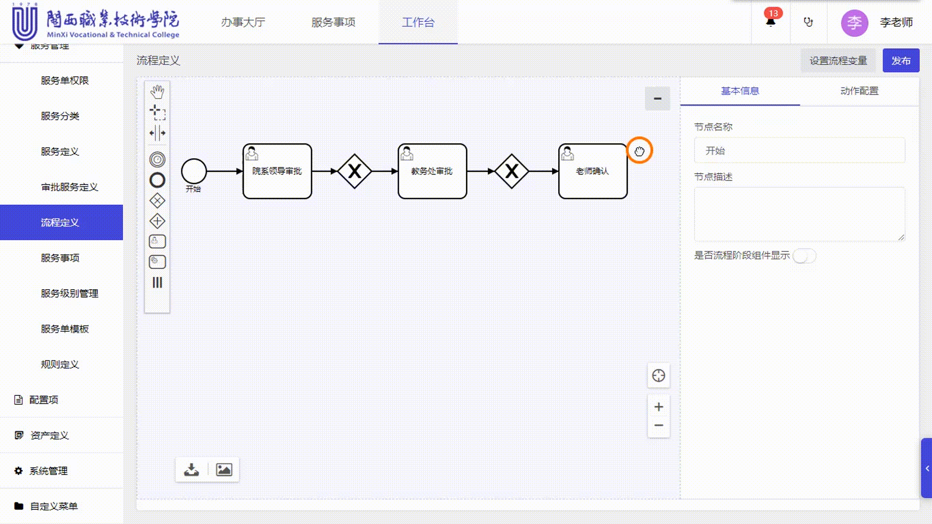 尊龙时凯为高校网上办事大厅提供专业的流程咨询,帮助系统“极简”部署,只要30分钟即可上线。其中可视化表单配置拥有丰富组件,支持自动布局;“零代码”实现可视化流程设计,降低使用门槛,简单拖、拉、拽的方式,让上线业务像画流程图一样简单,让建设部门维护更轻松。