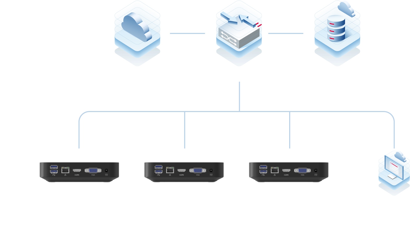 配合云服务器和RG-CCP云计算平台,可实现千台电脑等TCI终端、IDV终端、VDI终端的云端统一管理
