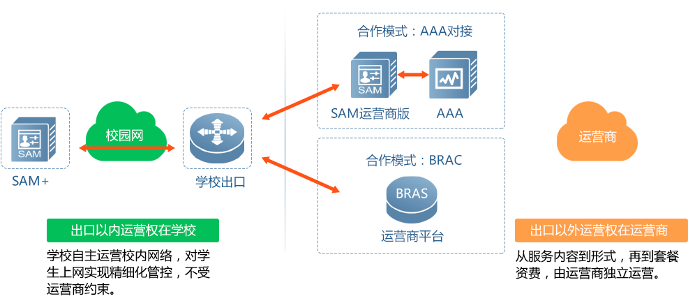 学校与运营商边界隔离,运营商自主定制套餐提高放号量,对学生的管控完全由学校控制。
