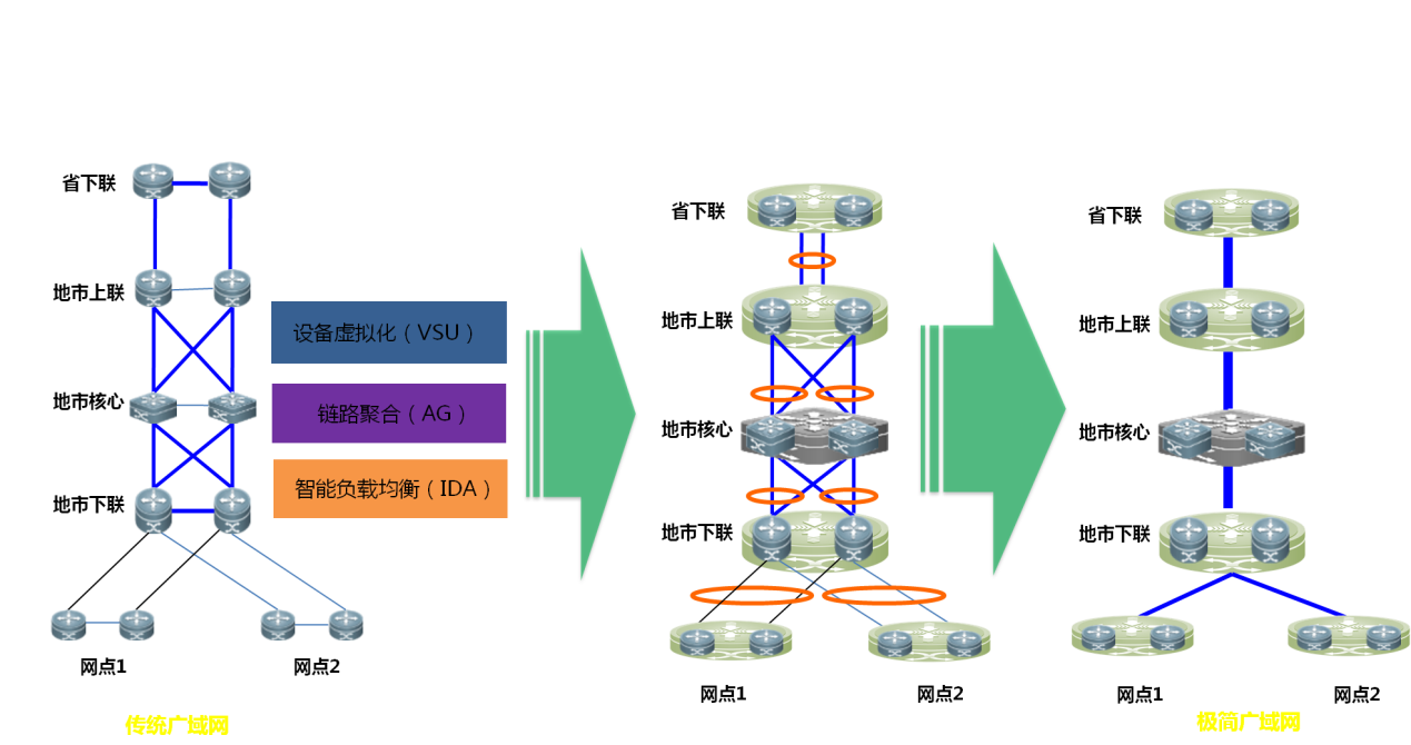 方案采用虚拟化技术将同级机构的两台设备虚拟为一台,两条或多条广域网链路聚合成一条。从逻辑上来看,整个网络的节点和链路数量减少了50%,这样整个网络配置变得非常的简单,只要简单培训就可以进行配置和故障处理,极大地降低了银行基层人员的运维压力。