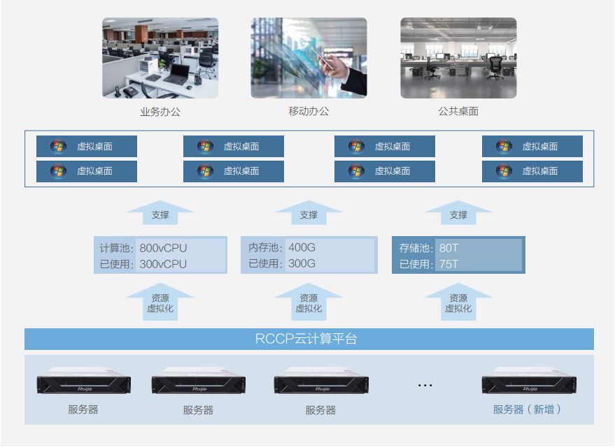 该方案通过在数据中心部署“桌面云服务器集群”,将桌面云替换传统办公PC,尊龙时凯RCCP云计算平台通过超融合技术,将底层服务器集群的计算、存储资源整合池化,并通过分布式存储保障数据的可靠性和可扩展性。池化后的资源,动态、按需分配给桌面虚拟机。在虚拟机上部署员工办公所需的操作系统和应用软件。