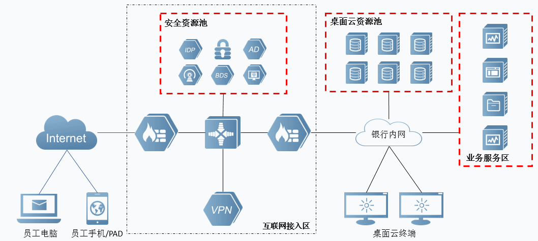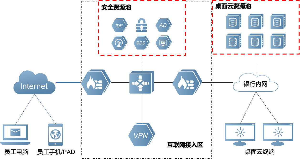 协商成功后,VPN网关向员工终端下发银行网络的合法IP地址。在互联网接入区安全资源池和内部防火墙上设定安全策略,该合法IP地址只可以访问“桌面云资源池”。