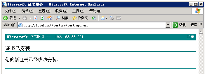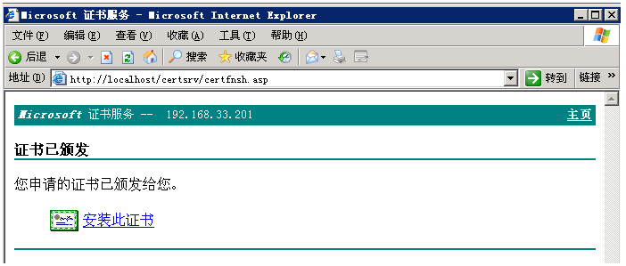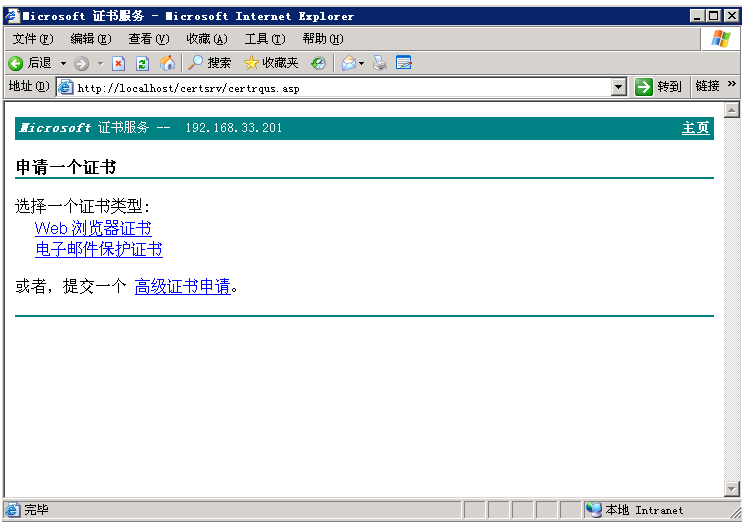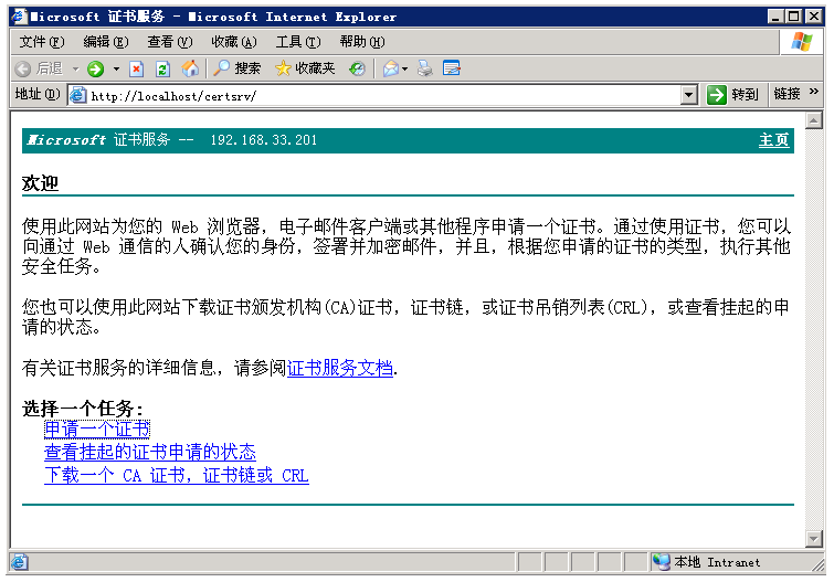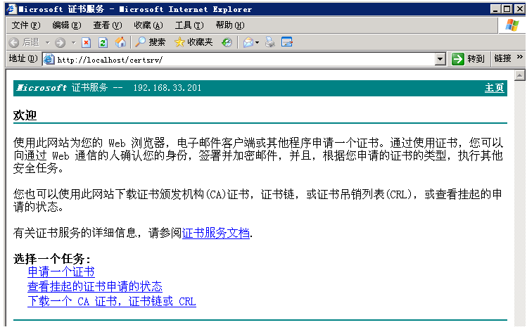 1) 运行Internet Explorer浏览器,在地址栏中输入“http://证书服务器IP/CertSrv/default.asp”,