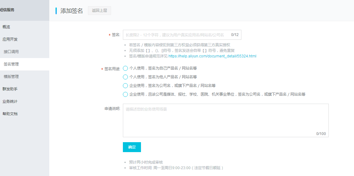 注:短信签名和短信模板需要审核,建议提前申请。完成申请后获取到记录短信签名和短信模板CODE ID,然后开始设备端的配置。