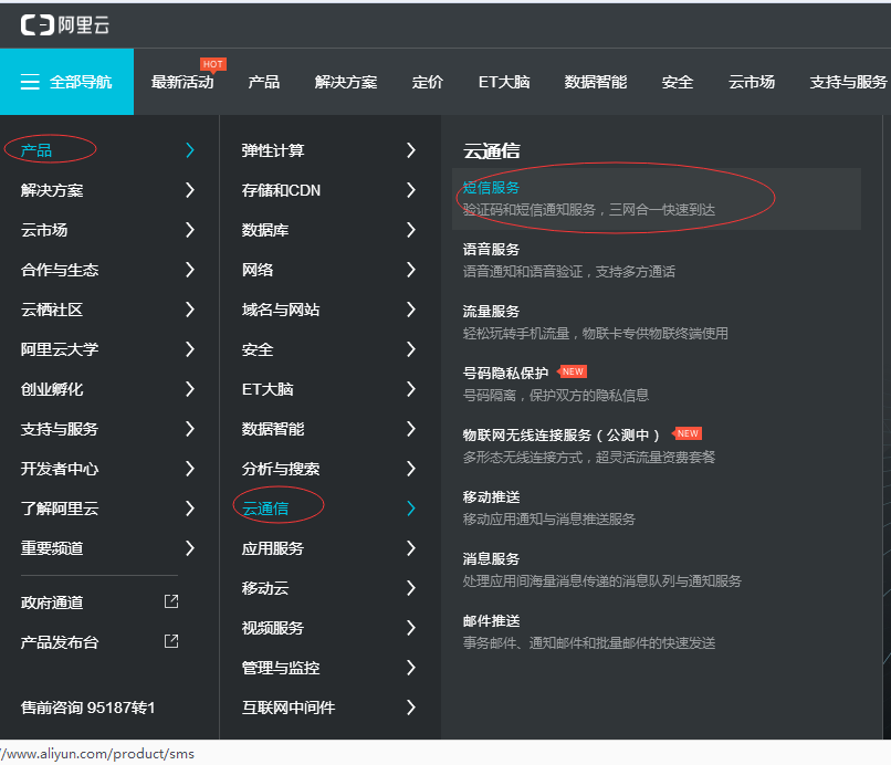 注册完成后登陆阿里云平台,通过导航菜单进入短信平台配置页面