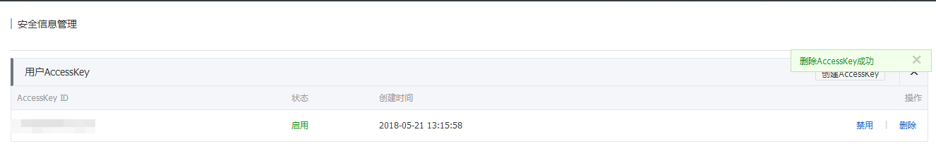 选择创建AccessKey,按照页面步骤完成创建同时保存AccesssKey信息