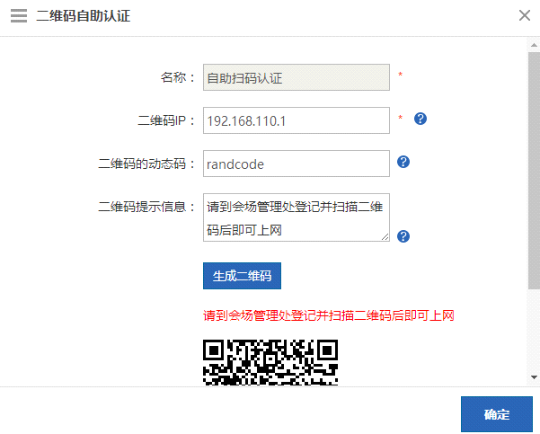 二维码自助认证是指二维码预先配置,并打印张贴在某处。终端连网后直接扫描该二维码即可完成上网。对于PC等无法进行扫码的终端,将显示二维码授权认证界面。