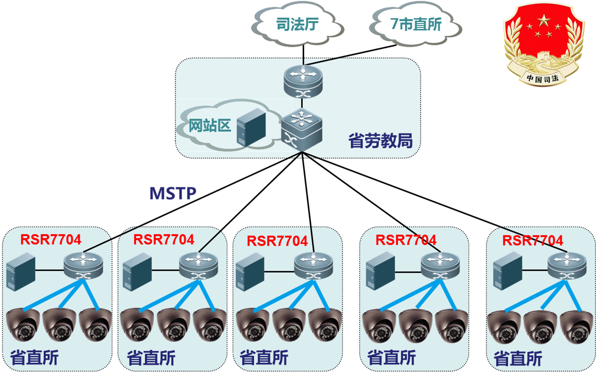 山东省司法系统的网络架构为星型扁平化架构,省司法厅下属的省劳教局集中管理5个省直所和7个市直所,省劳教局均采用MSTP专线方式下联各直所。各省直所均单独维护独立的视频监控系统,且通过MSTP专线将视频监控数据上传至省劳教局做分析、备份处理。