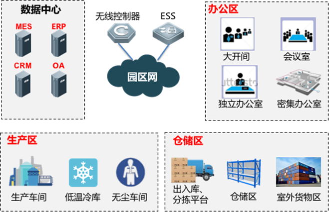 首先,“问题”会出现在无线网络部署环节。生产制造企业环境多种多样,既有高档写字楼一样的办公区,又有环境相对较差的生产区,在无线建设中要充分考虑不同环境下带来的影响。例如“办公室的厚墙、会议室高并发用户、仓库高大的货架、车间弥漫的粉尘、冷库等极限温度等等。