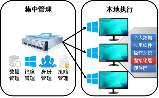 这种“集中管理本地执行”的架构,有效解决了“传统虚拟化过度依赖服务端和网络能力、无法利用本地资源”的业界难题,开创了虚拟桌面的未来发展。