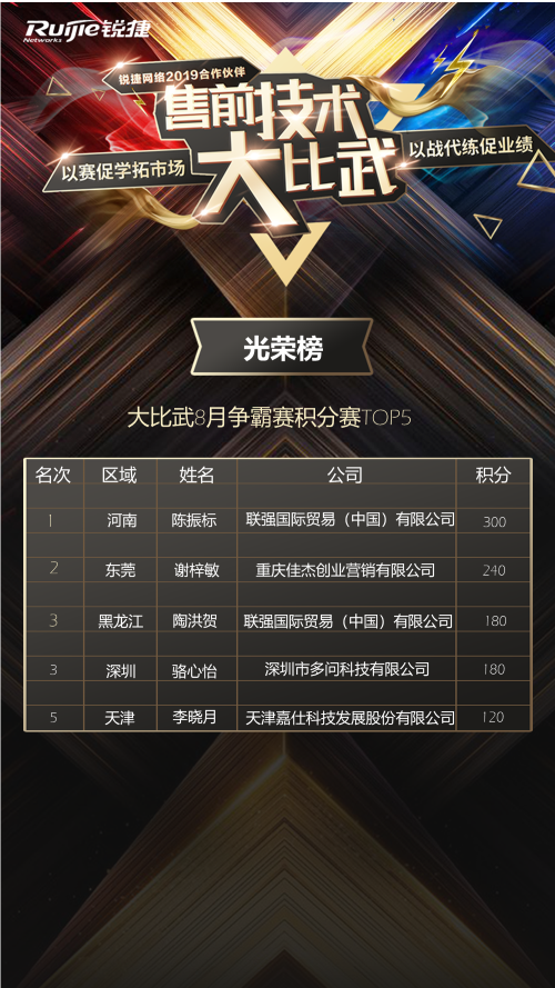 8月的积分赛,所有争霸赛区的选手围绕着经验分享、价值传递和项目支持展开了比拼,经过一个月的激励比拼,有5位选手脱颖而出,榜单如下: