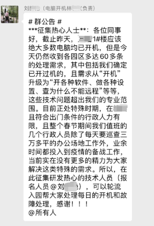 我清楚记得3号那天,我们全组基本没干多少活儿,最麻烦的就是配置环境,因为要远程办公,需要连接公司的电脑,本来打算用VPN连,后来发现代码数据仓库无法连接,几经求证后得知公司出于安全考虑,对代码数据仓库做了限制,即使连上VPN也无法访问代码服务器,这就需要现场运维人员打开工位电脑然后安装一个远程桌面的软件,来远程操控公司电脑,现场工作的运维就一个人,配置非常慢。第二天运维就不堪重负发了一篇公告