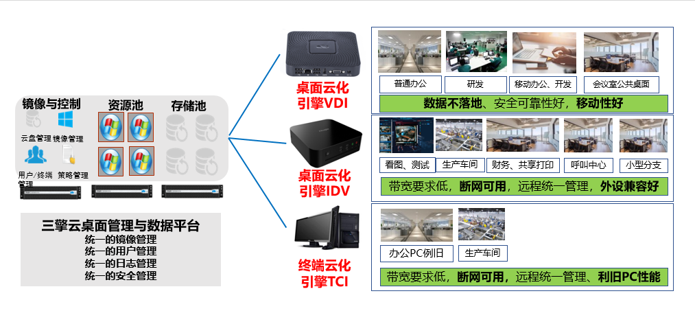 基于此,尊龙时凯今年推出了尊龙时凯企业三擎云桌面解决方案,方案面向终端利旧场景、桌面新购场景和应用迁移场景,可以提供对应的终端云化引擎、桌面云化引擎和应用云化引擎,从而实现对企业桌面终端多种场景的覆盖。