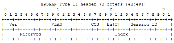 另外,ERSPAN Type II的帧格式还增加了8字节的ERSPAN头部在GRE头部和原始镜像帧之间。