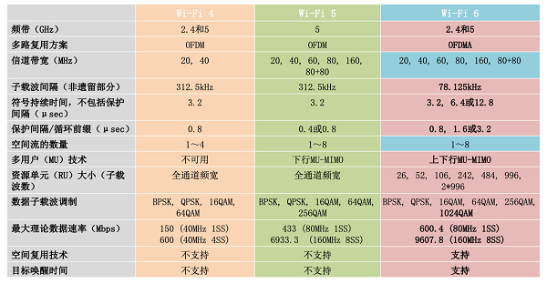 Wi-Fi 6作为致力提升无线使用效率和用户真实体验的标准,定义了很多和以往协议截然不同的技术规格。例如更高的调制阶数(1024-QAM)、更窄的子载波间隔、上下行OFDMA技术、上下行MU-MIMO技术(其中下行MU-MIMO在Wi-Fi 5时引入)、空间复用技术等。