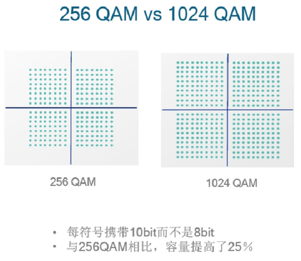 1024-QAM(Quadrature Amplitude Modulation,正交振幅调制),这是一种调制方式,所谓调制就是将电信号转换为无线电波的过程,反之则称为解调,调制方式越高阶,转换过程中数据密度就越高。