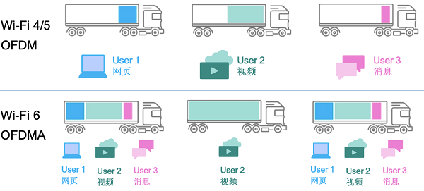 OFDMA划分的射频资源单元就像把货车的载货箱划分了很多小格子,这样货车在拉货时就可以进行灵活组合,不论是拉大货物还是小货物,都可以装满整个货箱再出发,充分利用每台货车的资源。