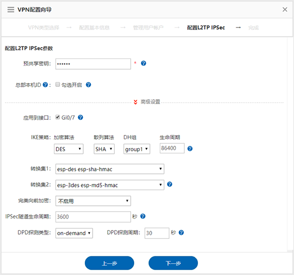 5)   在配置IPSec的IKE策略和转换集时需要注意,要提前确认好VPN终端支持的IPSec协商参数,确保所有VPN终端都可以和VPN设备IPSec协商成功,如果无法确认可以使用以下的协商参数(IKE策略:DES-SHA-Group1,转换集:ESP-DES、ESP-SHA-HMAC),目前大多数主流的终端设备都支持该协商参数