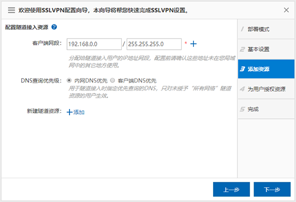 3)   在进行VPN基本信息的配置时需要注意,客户端使用地址要确保未在局域网中使用,否则会造成通信异常,此外建议DNS服务器配置成和局域网用户相同的DNS避免资源访问异常
