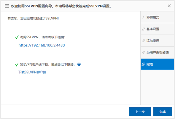 6)   在SSL VPN配置成功界面会显示SSL VPN地址,网络管理员将SSL VPN地址同步给VPN使用者,VPN使用者安装好SSL VPN客户端输入SSL VPN地址完成SSL VPN接入