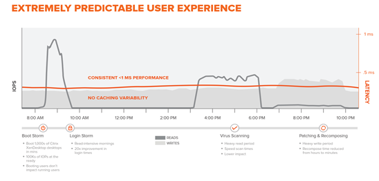 • 完整克隆:51%的48KB和64KB顺序读,17%顺序和随机各半的32KB读,最后是17%的4KB的随机读IO。完整的克隆压力同时体现在高带宽,按照xstream io的测试,4000个桌面10分钟起机完成,IOPS 250K,峰值BW在9GB/s。